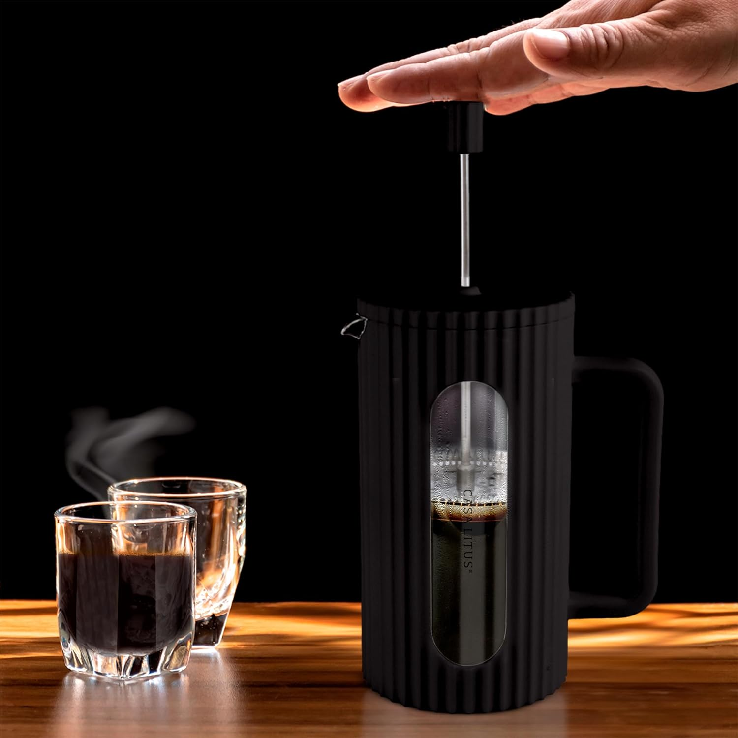 Baja el émbolo lentamente con presión suave y pareja. Sirve inmediatamente — no dejes el café en la prensa después de prensar, continuará extrayendo.